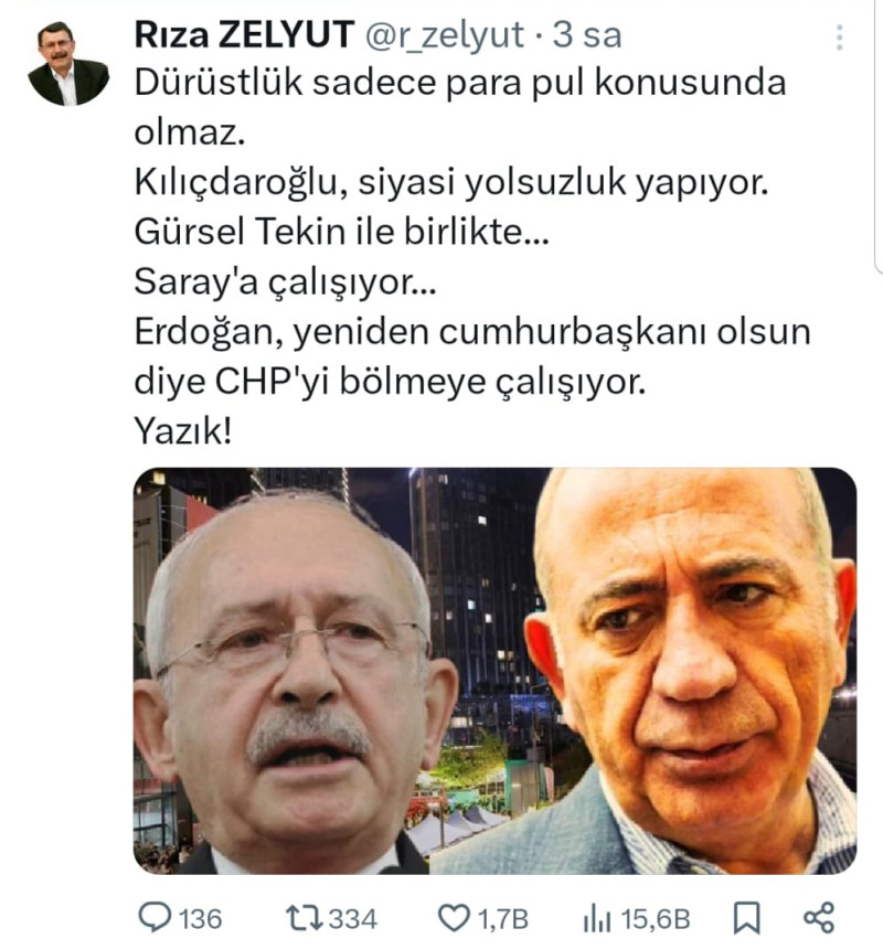 “Dürüstlük sadece para pul konusunda olmaz. Kılıçdaroğlu siyasi yolsuzluk yapıyor. Gürsel Tekin ile birlikte… Saray'a çalışıyor… Erdoğan yeniden cumhurbaşkanı olsun diye CHP’yi bölmeye çalışıyor. Yazık!”