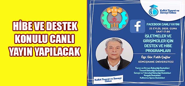 GÜMÜŞHANE / GÜNDOĞUMU Kelkit Ticaret Odası 25 Eylül (Cuma) günü saat 17:00’den itibaren sosyal medya facebook sayfasından Gümüşhane’deki İşletmeler ve Girişimciler için destek ve hibe programları konulu canlı yayın yapacak. Kelkit Ticaret Odası Başkanlığından yapılan açıklama da, katılımın herkese açık olacağı ve online olarak soru sorulabileceği ifade edildi.