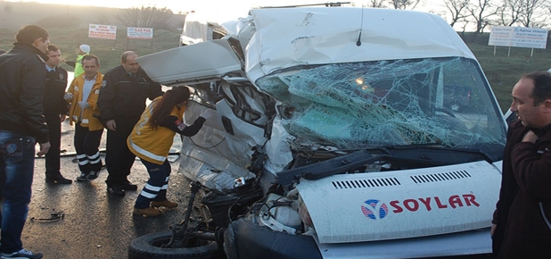 Kaza dün saat 07.30 sıralarında meydana geldi. İddiaya göre Kızılpınar Çerkezköy istikametinde seyir halinde olan ve Hemzemin Geçit yol ayrımına dönmeye çalışan Levent Yıldırım’ın (42) kullandığı 59 S 9380 plakalı servis aracı ile Çerkezköy Çorlu istikametinde seyir halinde olan Aydın Avcı’ın (32) kullandığı 34 BM 7961 plakalı servis aracı kafa kafaya çarpıştı.