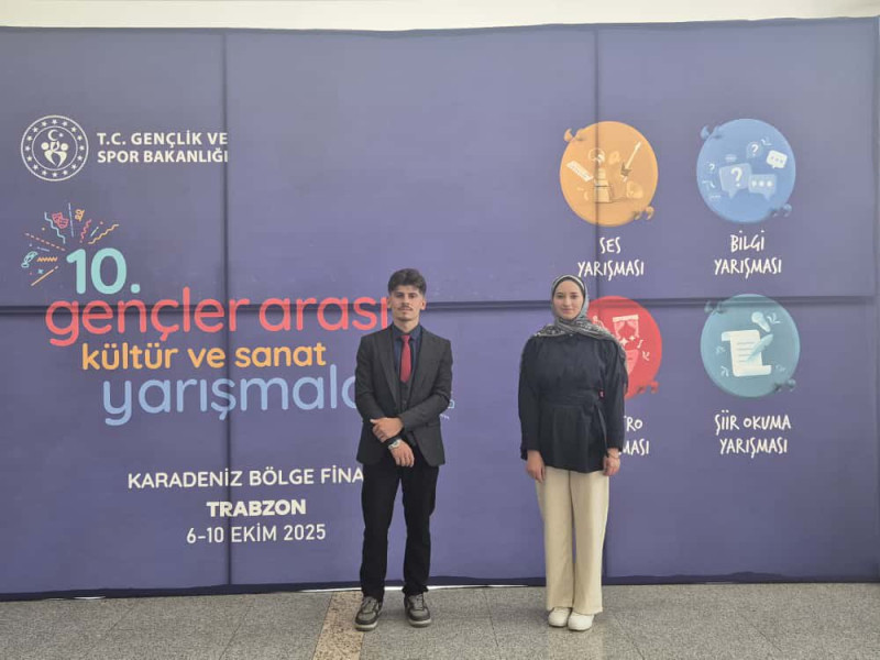 Trabzon’da 6-8 Ekim 2025 tarihleri arasında gerçekleştirilen 10. Gençler Arası Kültür ve Sanat Yarışmaları Bölge Finalinde, Gümüşhane’yi temsil eden Ömer Hamza Ayhan, “18-25 Yaş Gençler Arası Şiir Okuma Yarışması” kategorisinde Karadeniz Bölge birinciliği elde etti.