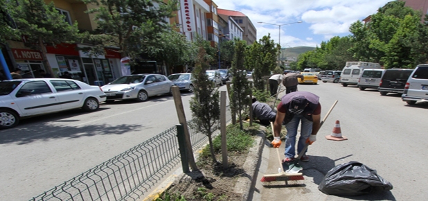 Bayburt Belediyesi Park ve Bahçeler Müdürlüğü ekipleri, kavşak ve orta kaldırımlarda ağaç diplerinin çapalanması, yeşillendirilmesi ve düzenlenmesi çalışmalarını sürdürüyor