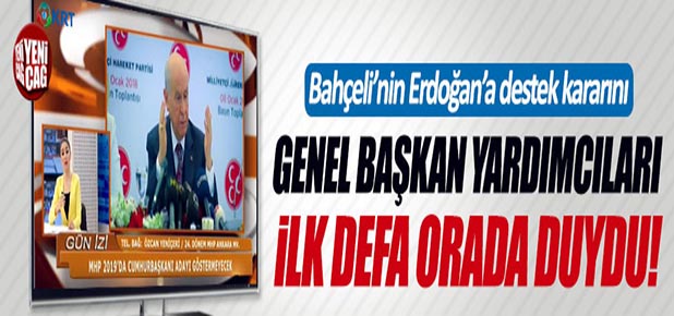 Devlet Bahçeli'nin 2019'da Cumhurbaşkanı Erdoğan'ı destekleyeceğini açıklaması üzerine konuşan Yeniçağ yazarı Özcan Yeniçeri, "Yanında bulunan MHP'nin Genel Başkan Yardımcıları bile basın toplantısında Bahçeli'nin söylediklerini ilk defa duydular" dedi.