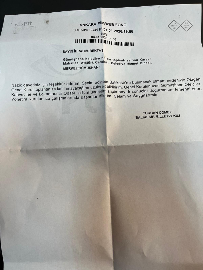 Gümüşhane Otelciler, Lokantacılar ve Kahveciler Odası, yeni dönem için olağan kongre sürecine girerken dikkat çeken bir nezaket örneği yaşandı. Oda yönetimi tarafından kongreye davet edilen İYİ Parti Balıkesir Milletvekili Turhan Çömez, program yoğunluğu nedeniyle toplantıya katılamayacağını bildiren bir mesaj gönderdi.