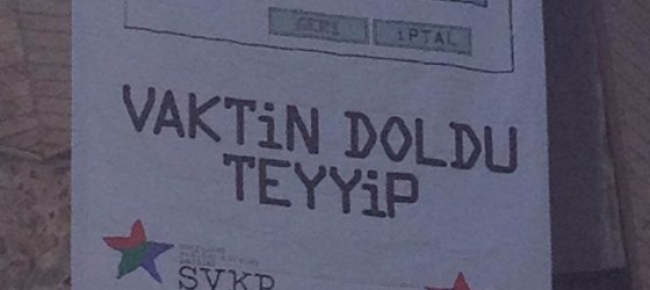 Başbakan Erdoğan bugün Marmaray'ın açılışı için Üsküdar'da konuşmasını yaparken bir grup SYKP ve DEVLİS üyesi Kız Kulesi balkonundan 'Vaktin doldu Teyyip' yazan bir pankart açtı.